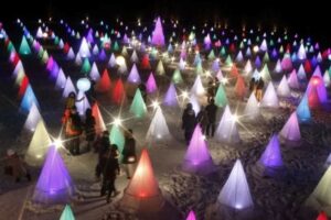 かまくら群:20基以上の雪のかまくらが並び、昼間は真っ白な雪原、夜には温かい光で照らされ、とても幻想的な風景になります。