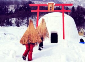 かまくら神社:敷地内には雪で作られた神社もあり、赤い鳥居が印象的。自由に参拝でき、中をのぞいたり写真を撮る観光客もおります。