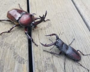 ※カブトムシは「完全変態」をする昆虫です(卵→幼虫→さなぎ→成虫)幼虫の時は、腐葉土や朽ち木の有機物(デトリタス)を食べ、成虫になると主に樹液(クヌギやコナラなど)を吸い、また果物やゼリーも好みます。