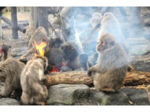 焚き火のまわりに集まるニホンザルたち:火を怖がるどころか、群れで焚き火に寄り添い体を温める姿は愛嬌たっぷりで、寒い季節ならではのほっこりする光景です。