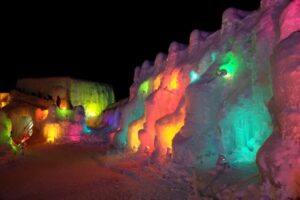 夜になると、カラフルなライトアップが施され、幻想的かつアート的な氷空間に変化します。