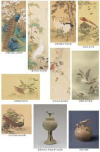 鳥は古来、長寿や繁栄の象徴として、また季節の変化を感じさせる存在として描かれてきました。空を飛ぶ姿、水辺にたたずむ姿、木の上で羽を休める様子など、多彩な姿が画面を彩ります。